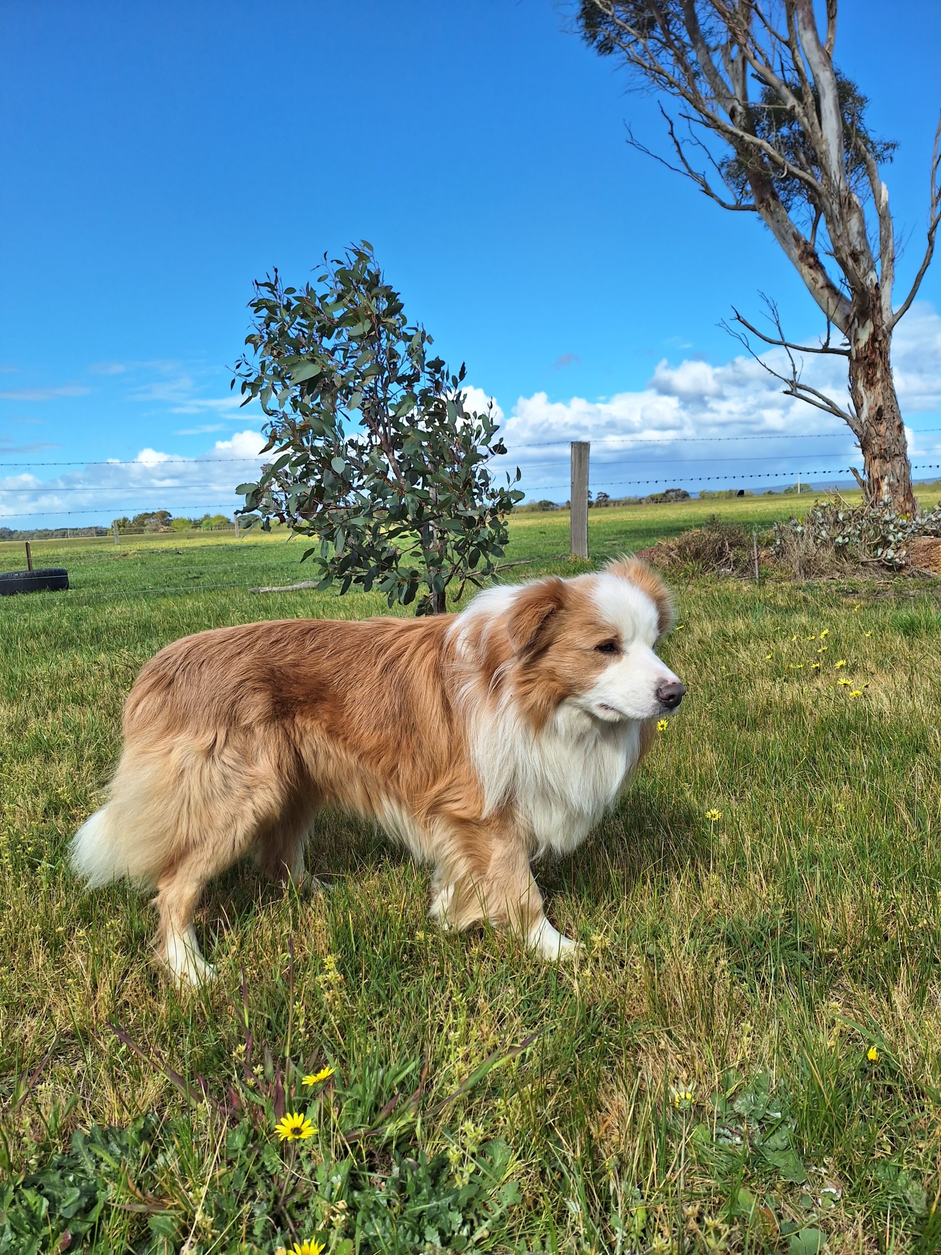 Chilli is our amazing red & white female border collie. She is obedient and affectionate. Chilli has a beautiful personality and loves playing chase with the other dogs. Please note that this dog is not for sale.